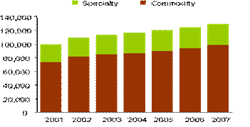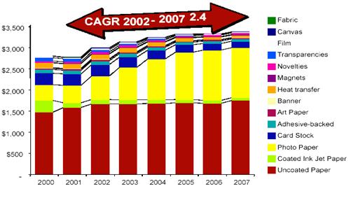 統(tǒng)計(jì)數(shù)據(jù)表明,美國(guó)家用電腦和打印機(jī)的普及培育了桌面噴墨打印的市場(chǎng),2004年噴墨方式輸出的1160億張打印紙中,特殊打印介質(zhì)將近300億張,預(yù)期2002年至2007年間普通噴墨打印紙和特殊打印介質(zhì)均會(huì)有穩(wěn)定增長(zhǎng),這段時(shí)間內(nèi),噴墨打印介質(zhì)的打印數(shù)量年度遞增率(CAGR)為3.5%。2004年美國(guó)整個(gè)噴墨介質(zhì)的收入超過(guò)32億美元,其中普通產(chǎn)品約17億美元,透明片或其它膠片薄膜產(chǎn)品0.5219億美元,特殊打印介質(zhì)超過(guò)13億美元。雖然普通產(chǎn)品(commodity)仍是噴墨打印的主要輸出對(duì)象,數(shù)量上占了總噸數(shù)的75%,但由于價(jià)格低,其銷售額只占總銷售額的40%。 2005年預(yù)期桌面噴墨打印的總量將超過(guò)1202億張,市場(chǎng)份額33億美元。2002-2007年間預(yù)期噴墨打印紙的銷售額年遞增率2.4%。特殊打印介質(zhì)包括彩噴紙(Coated paper),照片打印紙(Photo paper),明信片紙,背膠,油畫紙,標(biāo)簽紙等等。在特殊打印介質(zhì)的增長(zhǎng)中,彩噴紙的增長(zhǎng)速度相比較慢,而照片打印紙?jiān)鲩L(zhǎng)速度很快,預(yù)計(jì)2002-2007年間照片打印紙的年遞增率將高達(dá)16%!這種增長(zhǎng)歸功于低價(jià)位數(shù)碼相機(jī)的熱銷;低于50美元打印機(jī)的銷售;和數(shù)字圖像傳輸?shù)目旖菪浴?/span>