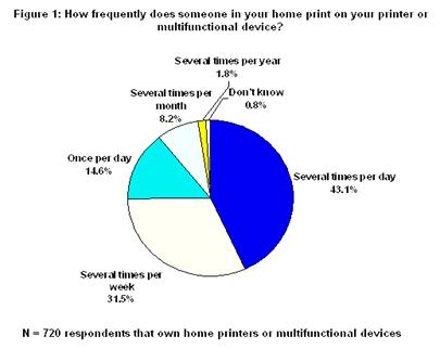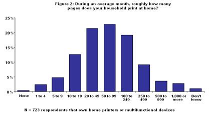 2003年8月CAP Ventures 通過(guò)對(duì)全美網(wǎng)上擁有家庭打印機(jī)的用戶進(jìn)行打印習(xí)慣調(diào)查,共有超過(guò)700名用戶參與調(diào)查并做有效回答,用戶使用打印機(jī)的頻率和打印張數(shù)下圖所示: