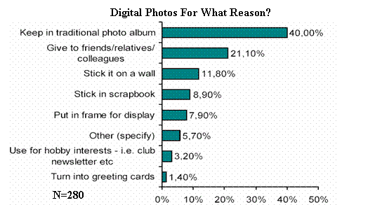 至于影像的輸出問(wèn)題,兩種不同的打印方式同時(shí)占據(jù)市場(chǎng)并共同發(fā)展。一是用戶自己在家打印,從拍攝到輸出,全部自己搞掂。第二是通過(guò)專業(yè)連鎖店(在線或不在線)或零售打印店打印“照片”。對(duì)于輸出的影像,40%的用戶仍象傳統(tǒng)感光照片一樣將之保存在相冊(cè)中,21.1%的用戶將照片贈(zèng)給親友或同事。
