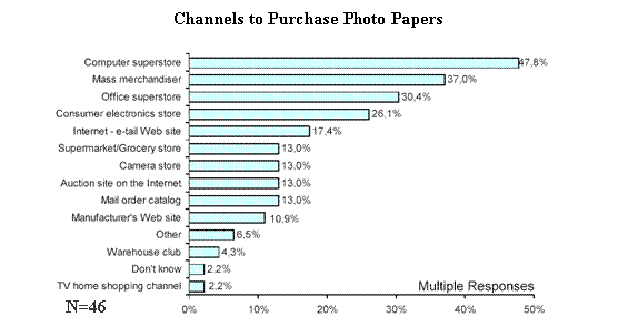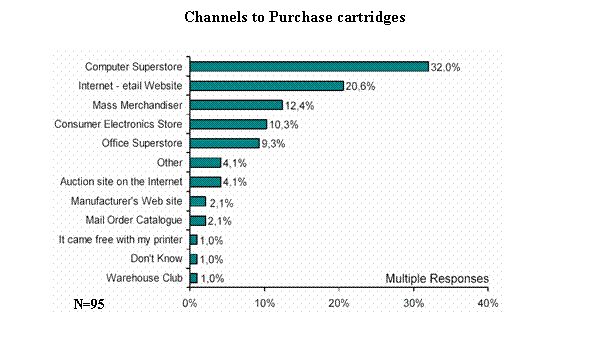調(diào)查機(jī)構(gòu)發(fā)現(xiàn):用戶購(gòu)買照片墨水和介質(zhì)的渠道有較大區(qū)別,雖然電腦超市都是用戶最常去的場(chǎng)所,但墨水的銷售很多是通過(guò)Internet和大型超市實(shí)現(xiàn)的,而介質(zhì)通過(guò)Internet網(wǎng)的銷售方式僅排第5位,大量用戶選擇在大型超市、辦公品商場(chǎng)購(gòu)買。用戶選擇在辦公品商場(chǎng)購(gòu)買墨水的比例僅占9.3%。上述區(qū)別的原因可能是:用戶對(duì)墨水品質(zhì)保證的關(guān)注程度高于介質(zhì),顯而易見相比于介質(zhì),墨水對(duì)打印機(jī)可能能造成更大的傷害。