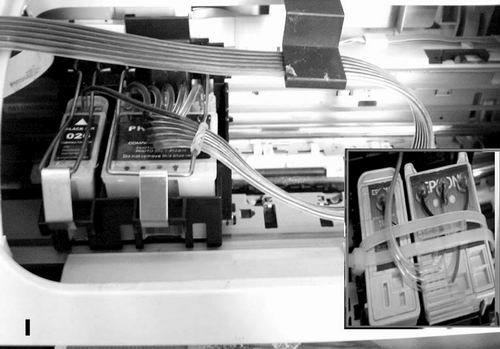 內(nèi)墨盒上面插有排管,這樣就造成原有墨車蓋子無法蓋上,最早的辦法是將墨盒捆扎在墨車上,或者將墨車蓋子取下用鐵絲制作的架子代替,以便固定內(nèi)墨盒(圖6)。而目前有幾個(gè)比較好的辦法: