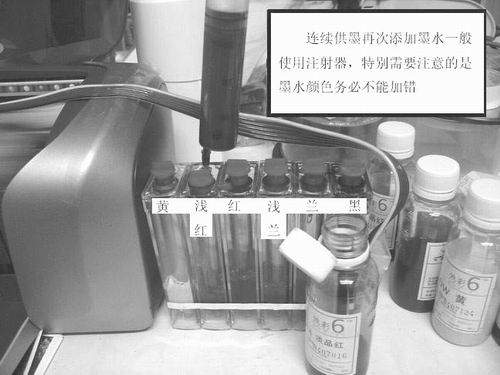 3.打印機(jī)使用連續(xù)供墨系統(tǒng)以后的日常保養(yǎng)工作不可忽視以下幾點(diǎn):①打印機(jī)擺放位置不能被日光直接照射,同樣,外墨盒盡量不要長期被紫外線照射,以免外墨盒墨水保存時(shí)間縮短,如果受使用條件的限制,可以將外墨盒做遮光處理或者選用外墨盒有防紫外線盒子的連續(xù)供墨。②外墨盒上都有通氣孔,打印機(jī)的使用環(huán)境就需要注意防塵工作。③打印機(jī)不能長期不使用。噴頭在打印中是否有斷線,與氣候、環(huán)境、墨水質(zhì)量、自身狀況等都有關(guān)系,最好每半個(gè)月至少使用1次,氣候特別干燥的地區(qū)每周至少使用1次,如確實(shí)無打印任務(wù),可以打開打印機(jī)電源后,打印一張噴嘴檢查圖以便確定噴嘴狀況。④外墨盒再次添加墨水方法按照說明書操作即可,需要注意的是打印機(jī)外墨盒的墨水最好不要使用一點(diǎn)就馬上添加,墨水存放有一個(gè)保質(zhì)期,每色使用到一定極限再添加為好;添加墨水的時(shí)候也要注意不要加得過滿,更不能添加錯(cuò)顏色(圖14)。⑤不同牌子的墨水不要混用,如果要換其他牌子墨水,應(yīng)將外墨盒中的墨水抽干后再更換,顏料墨水和染料墨水之間需要互換,應(yīng)當(dāng)先將整個(gè)連續(xù)供墨系統(tǒng)的墨水都抽干凈并進(jìn)行清洗。